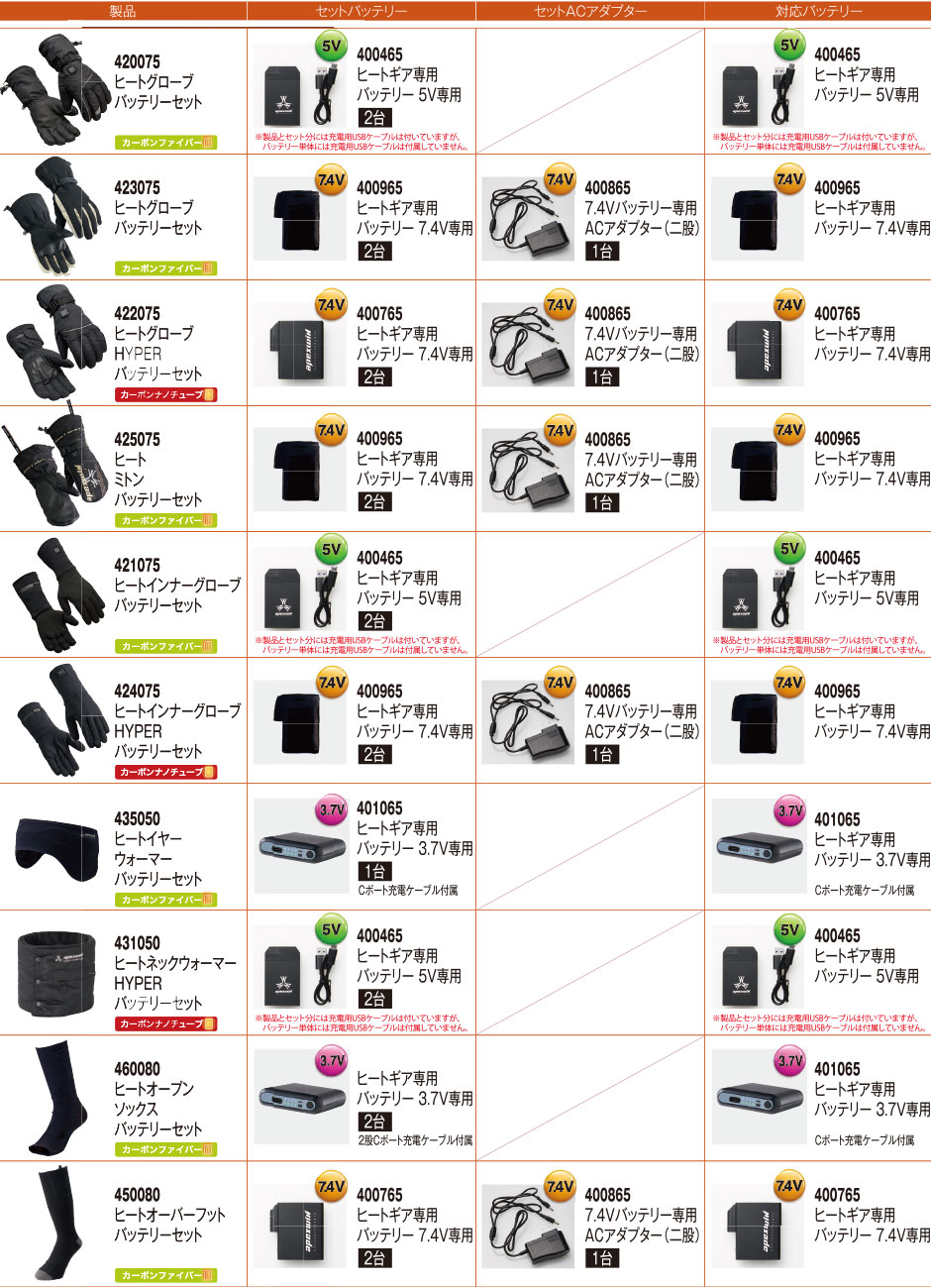 カーボンファイバー/7.4Vバッテリー/ACアダプター/シングルスイッチ/手洗い可/防風/防寒・保温/防水加工/防水設計/専用ミニバッテリー2台付属/手首アジャスター/バッテリーポケット/グローブリーシュコード/裾調節スピンドル/紛失防止バックル