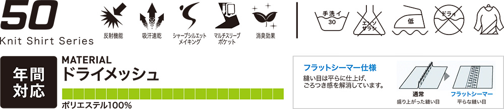 | 吸汗速乾、シャープシルエットメイキング、マルチスリーブポケット、消臭機能、反射機能 |
