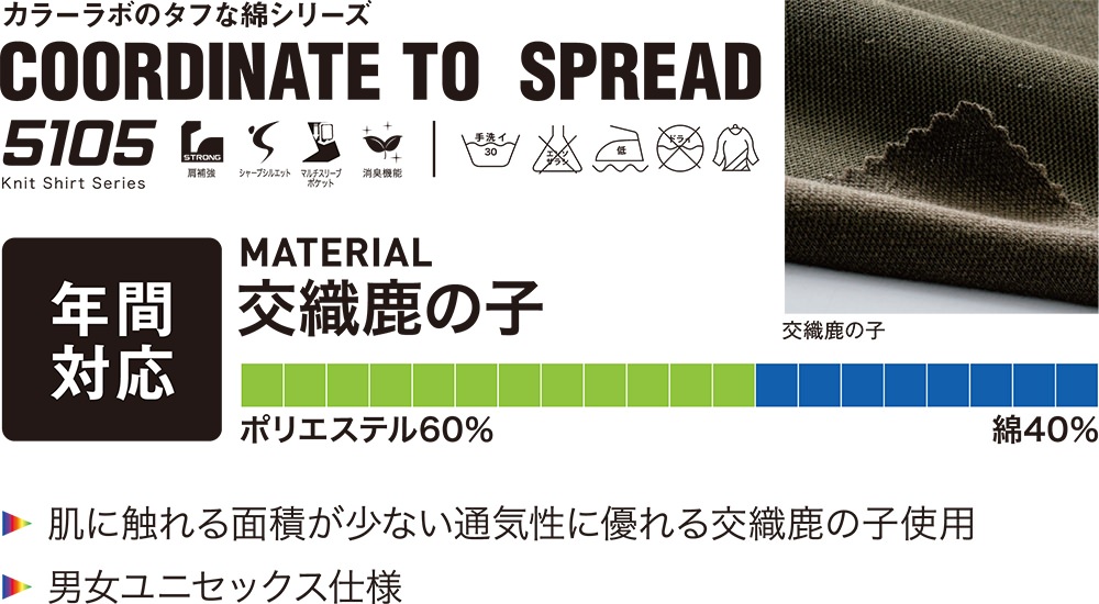 鹿の子素材と刺し子仕様で耐久性に優れる
