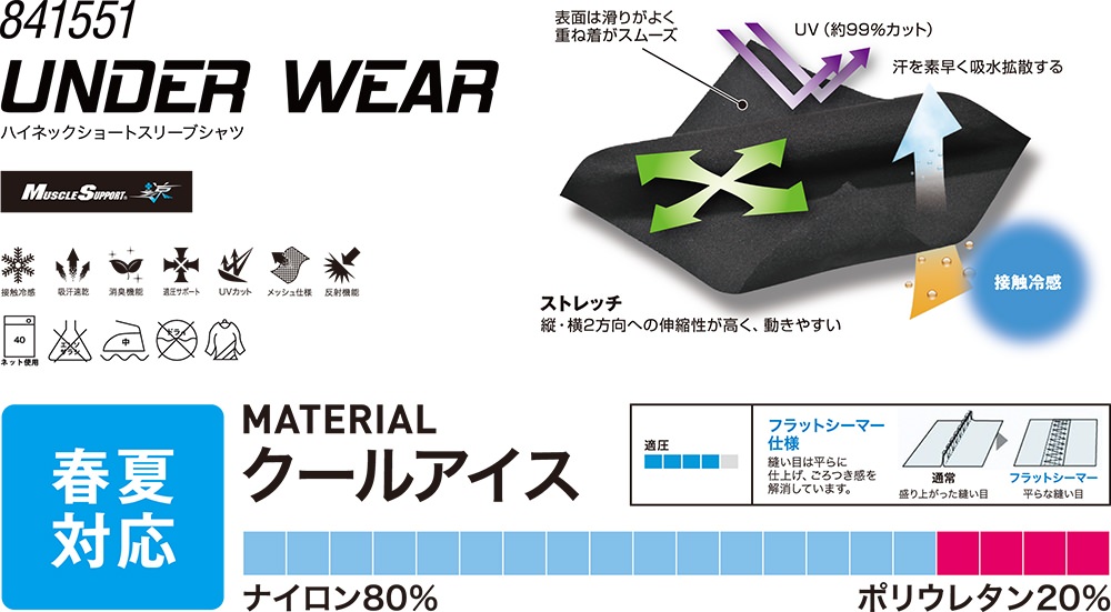 吸汗速乾、UVカット、消臭機能、適圧サポート、メッシュ仕様、反射機能、接触冷感