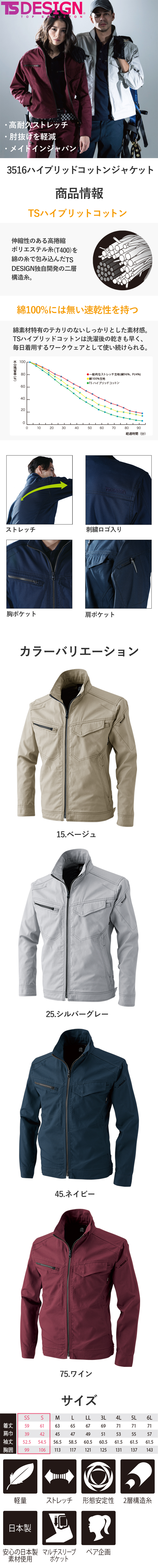 作業服 ブルゾン 綿100% 藤和 TS Design ハイブリッド コットンジャケット 3516 作業着 通年 秋冬 ジャケット・ヤッケ上着 高耐久 丈夫 ジャケット ブルゾン おしゃれ かっこいい 企業 法人 ワーク 作業 汗 工場 ゴルフ 釣り アウトドア