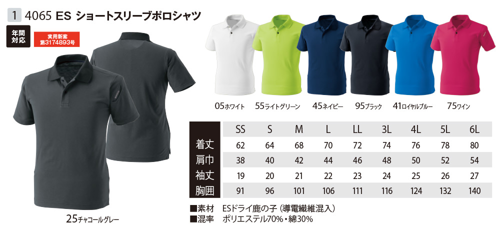 作業服 ポロシャツ 半袖 藤和 TS Design ES ショートスリーブポロシャツ 制電JIS T8118適合品 4065 作業着 通年 秋冬