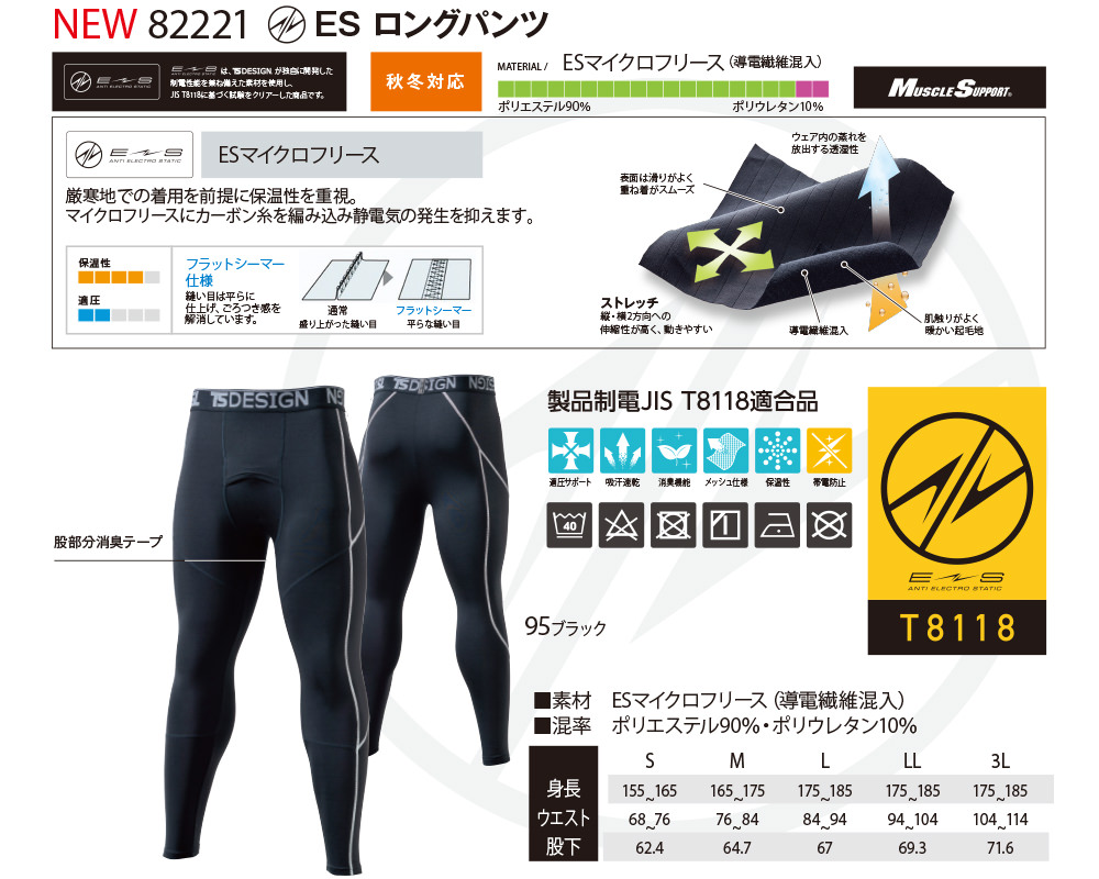 防寒 インナー パンツ メンズ 防寒着 藤和 TS Design ESロングパンツ 82221 タイツ スパッツ 秋冬 冬用 暖かい 防寒ウェア 冬用 タイツ スパッツ ゴルフ ホッケー ランニング 釣り つり スノーボード スキー 野球 テニス 冬用インナー