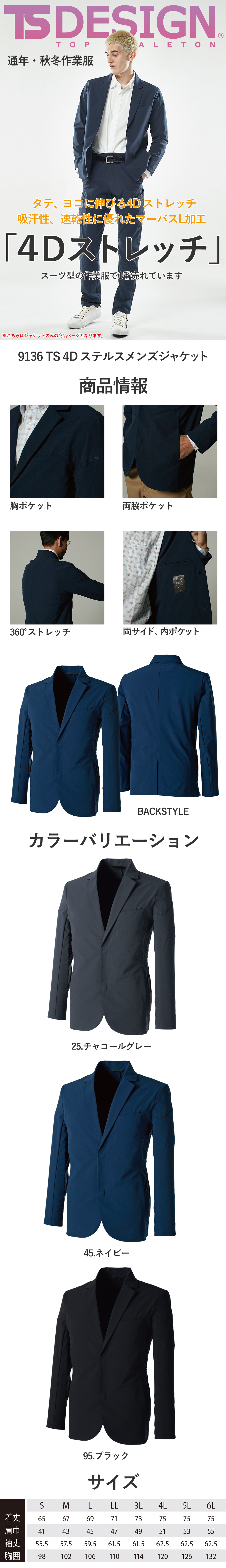 作業服 作業着 藤和 TS Design 9136 4D ステルスメンズジャケット ストレッチ テーラード スーツ風 上着 形態安定 定番 おしゃれ かっこいい 企業 法人 作業 ワークユニフォーム 仕事 大きいサイズ 3L 4L 5L 6L