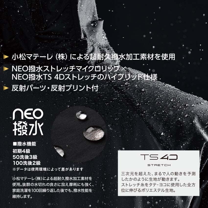 小松マテーレ(株)による超耐久撥水加工素材を使用、NEO撥水ストレッチマイクロリップ×NEO撥水TS 4Dストレッチのハイブリッド仕様、反射パーツ・反射プリント付