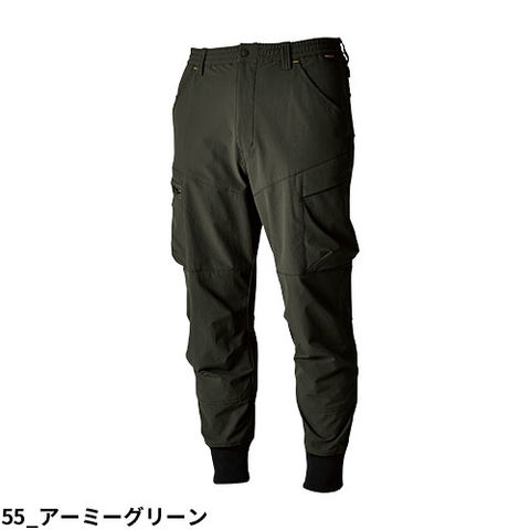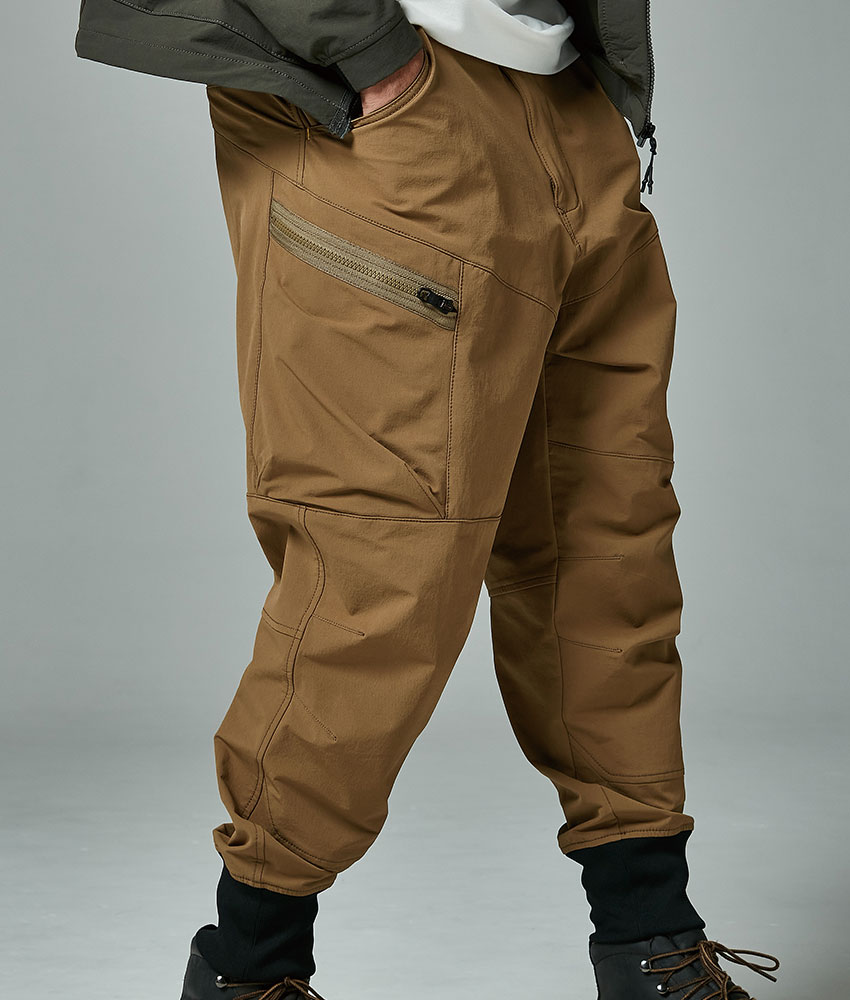 | フラップ付きカーゴポケット、右のカーゴポケットはファスナー仕様、リブ仕様、ウエストゴム仕様 |