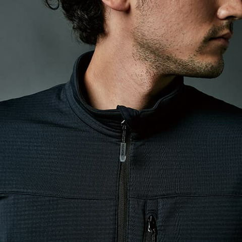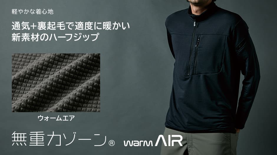 | ウォームエア:特徴的なブロック状の裏起毛が保温力と通気性を発揮する。暖かい状態をキープしながら、運動によって出てくる熱を外へ出す快適性を保つ、軽量ストレッチ素材で動きやすい点も特徴。ミドルレイヤー、インナーどちらでも使えるアイテムとなっている。 |