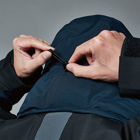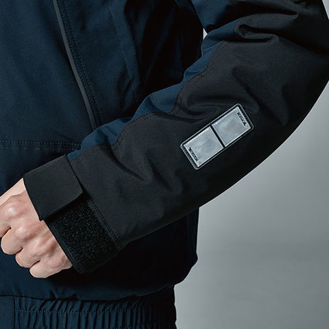 | ■視認性を高めるギミック 両袖部分にプリズム反射、正面のファスナーポケット位置に反射テープ、フード下部分に反射材を付けており、どこから見ても反射機能を発揮出来る仕様に。暗がりや夜間での視認性を高めている |