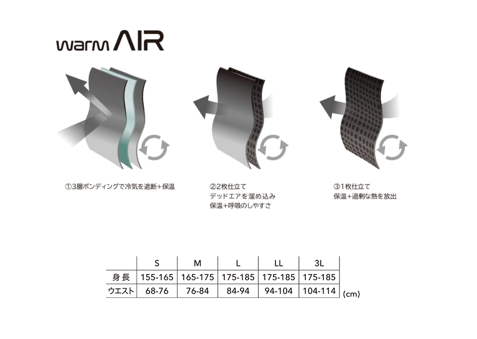 | ■首、上袖 マイクロフリース+防風フィルム+マイクロフリース。3層ボンディングで冷気を遮断+保温 ■ 前身頃 マイクロフリース+warm AIR ■枚仕立て。デッドエアを溜め込み保温 ■ 袖底、脇、背中 warm AIR 1枚仕立て。保温+過剰な熱を放出 |