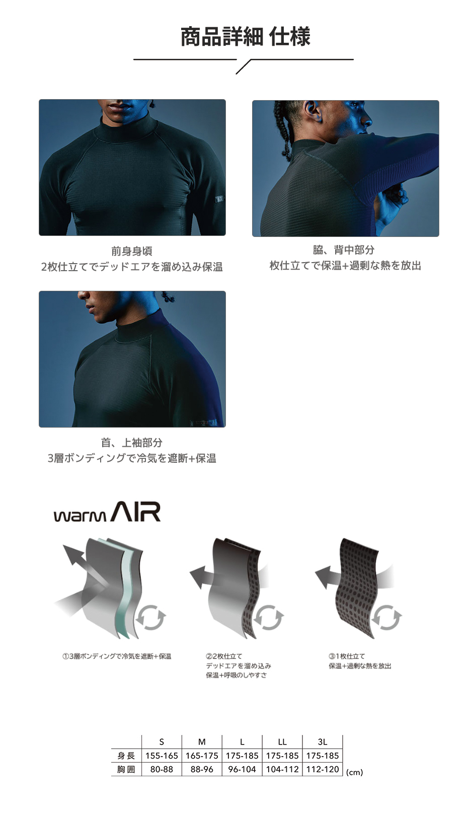 | ・後身はウォームエアを全面に使用 ・通気性と保温性を持つ防風インナー ・脇下消臭テープ付 ・縫製糸による静電気ケア |