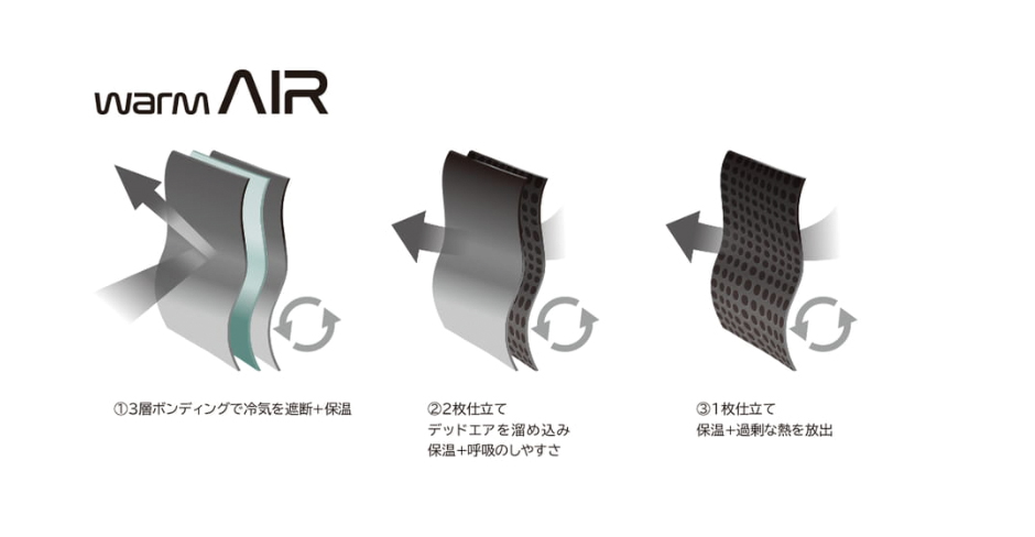 | ■3層ボンディングで冷気を遮断+保温 マイクロフリース+防風フィルム+マイクロフリース。 ■ マイクロフリース+warm AIR 2枚仕立て。 デッドエアを溜め込み保温 ■ warm AIR 1枚仕立て。 保温+過剰な熱を放出 |