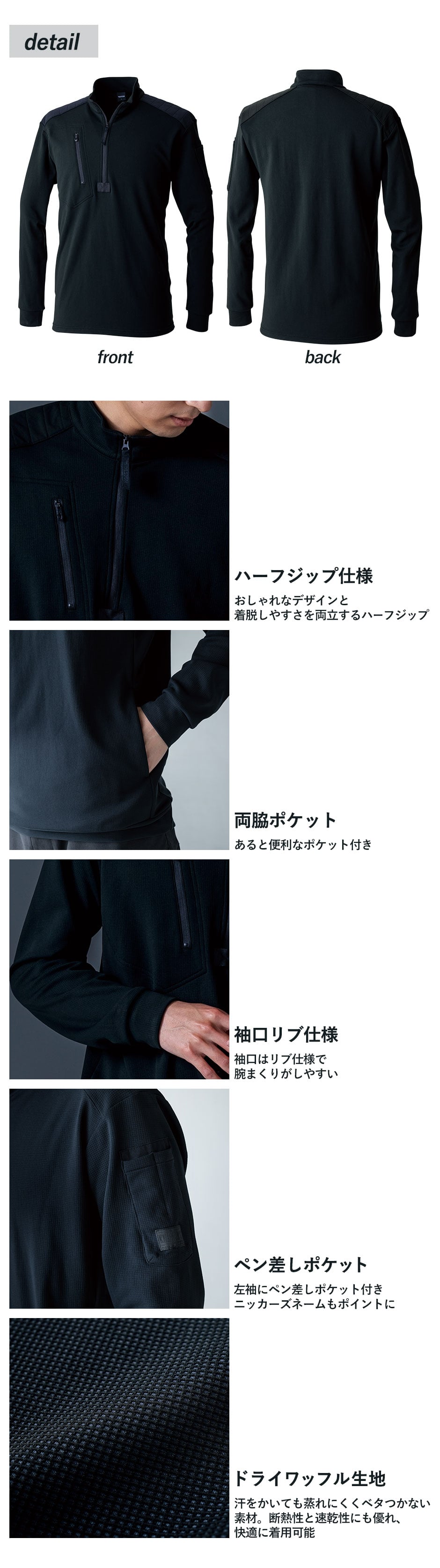ポリプロピレンによる疎水性、右胸ファスナーポケット、・袖リブ仕様、ハーフジップ仕様、左袖ペン差し