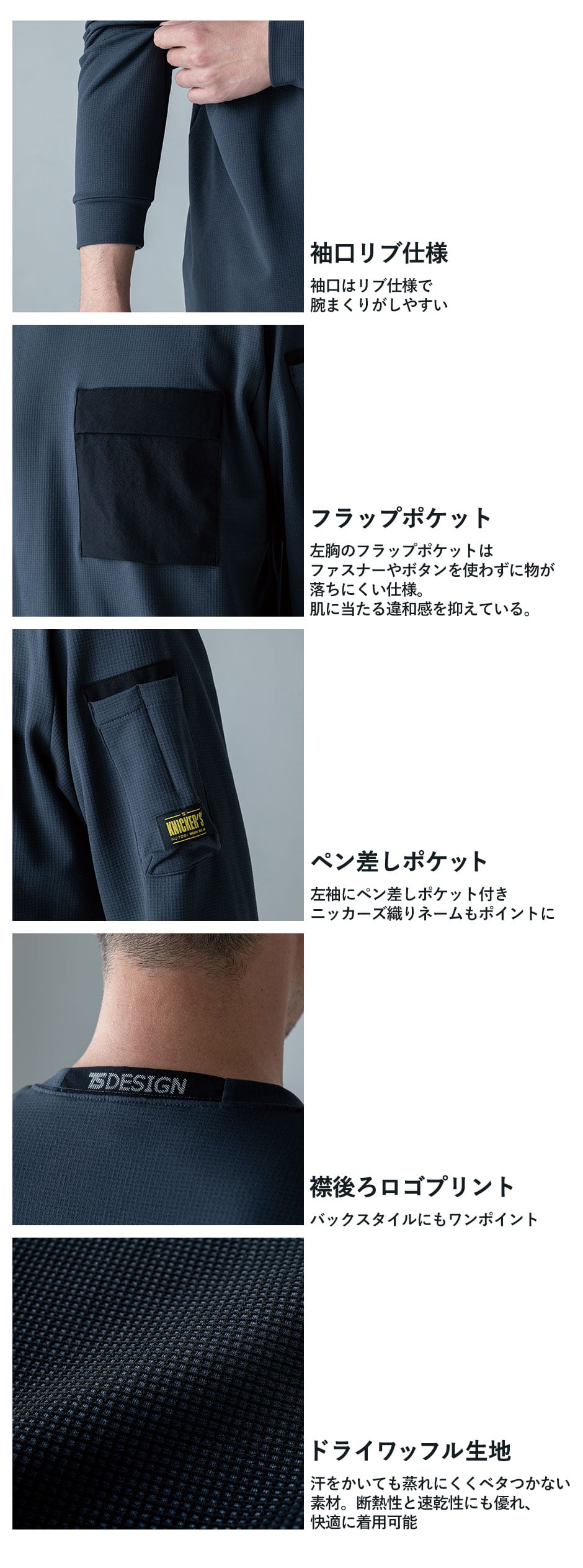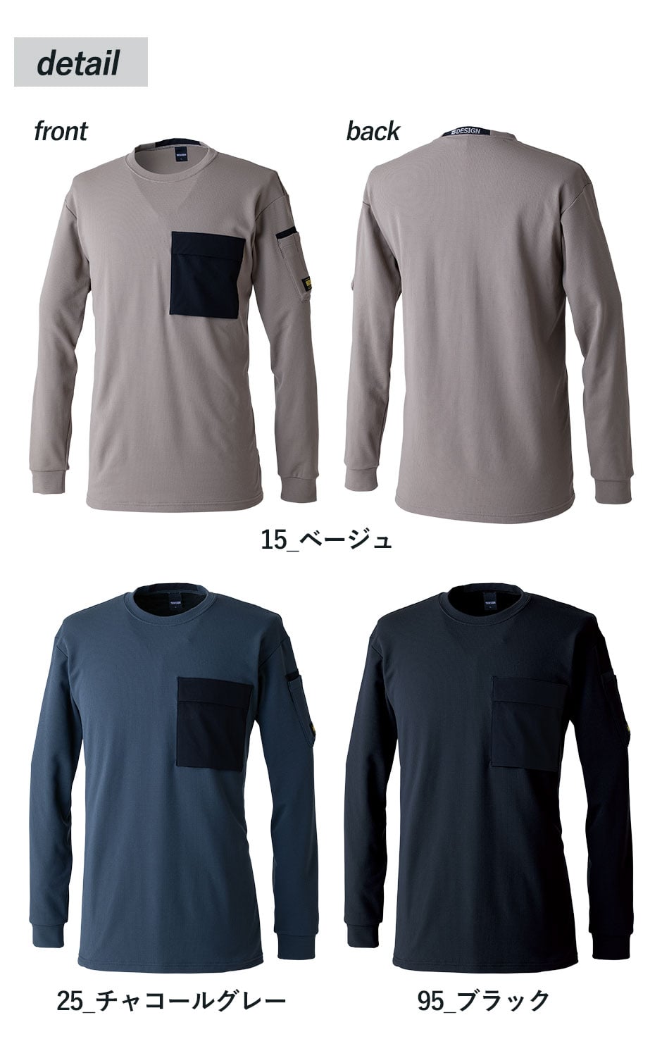 | ポリプロピレンによる疎水性、断熱性と速乾性に優れる、汗をかいても蒸れにくい、袖リブ仕様、左袖ペン差し、左胸フラップポケット |