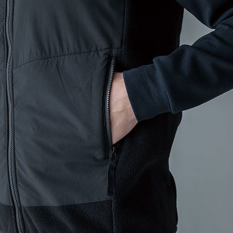ワークシーンでも安心して着用できるようにダメージを受けやすい箇所に強度の高い布帛を使用したハイブリッドデザインのフリースベスト