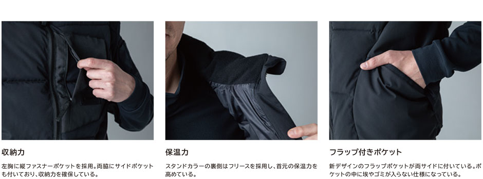 洗うことができるファイバーダウンを使用することで、ダウンの特徴である嵩高性、軽量性、保温性を持ちながらダウンのデメリットである水分や湿気に強い。