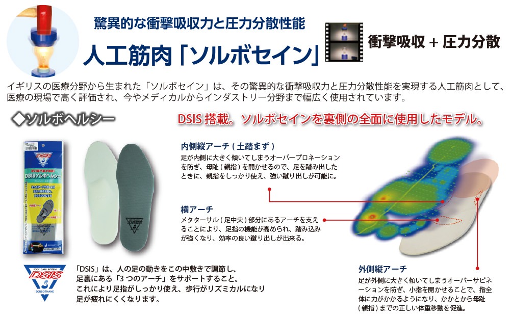 驚異的な衝撃吸収力と圧力分散性能を持つ、人工筋肉「ソルボセイン」を裏側全面に使用したモデル
