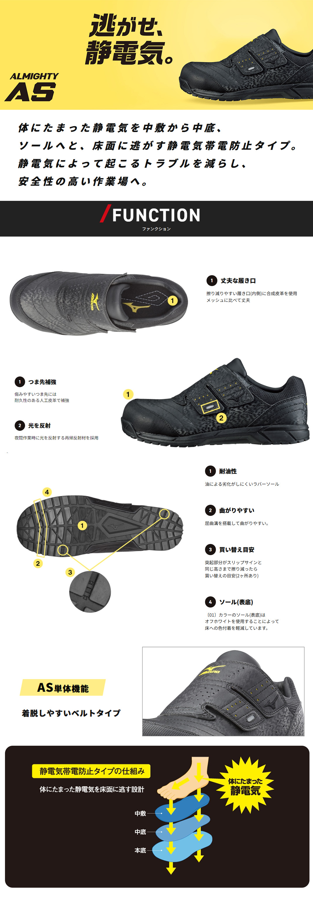安全靴 ミズノ MIZUNO オールマイティ AS 新作 スニーカー 静電気防止 静電気帯電防止タイプ 作業靴 メンズ レディース 男性用 女性用 幅広 軽量 滑りにくい 人工皮革 ストリート カジュアル かっこいい おしゃれ 日本人向け ALMIGHTY C1GA1811 倉庫業 運送業 運輸業