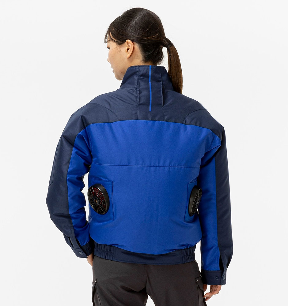 空気が通るのに膨らみにくいスタイリッシュな設計で、ファンにより取り込んだ空気が首の前後、腕から抜けるパターン採用