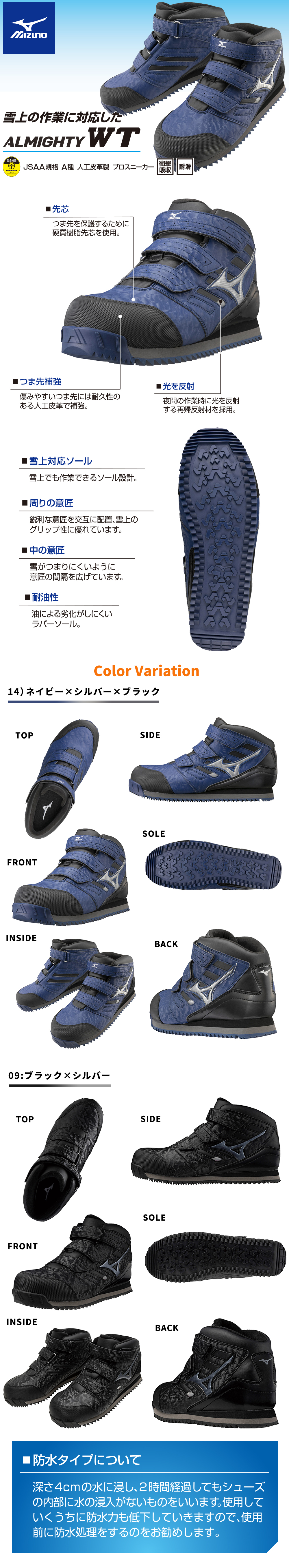 安全靴 ミズノ ハイカット MIZUNO オールマイティ 雪上防水シューズ メンズ ALMIGHTY WT マジックテープ ミッドカット JSAA規格 2023年 新作 限定 雪 防水 寒冷 寒冷地仕様 耐滑 軽量 雪上 雪上対応 人工皮革 シューズ 人気 おしゃれ おすすめ F1GA180414