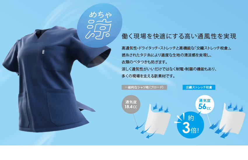 高通気性・ドライタッチ・ストレッチと高機能な「交織ストレッチ校倉」。撚糸されたタテ糸により適度な生地の清涼感を実現し、衣類のベタつきも防ぎます。涼しく通気性がいいだけではなく制電・制菌の機能もあり、多くの現場を支える新素材です。