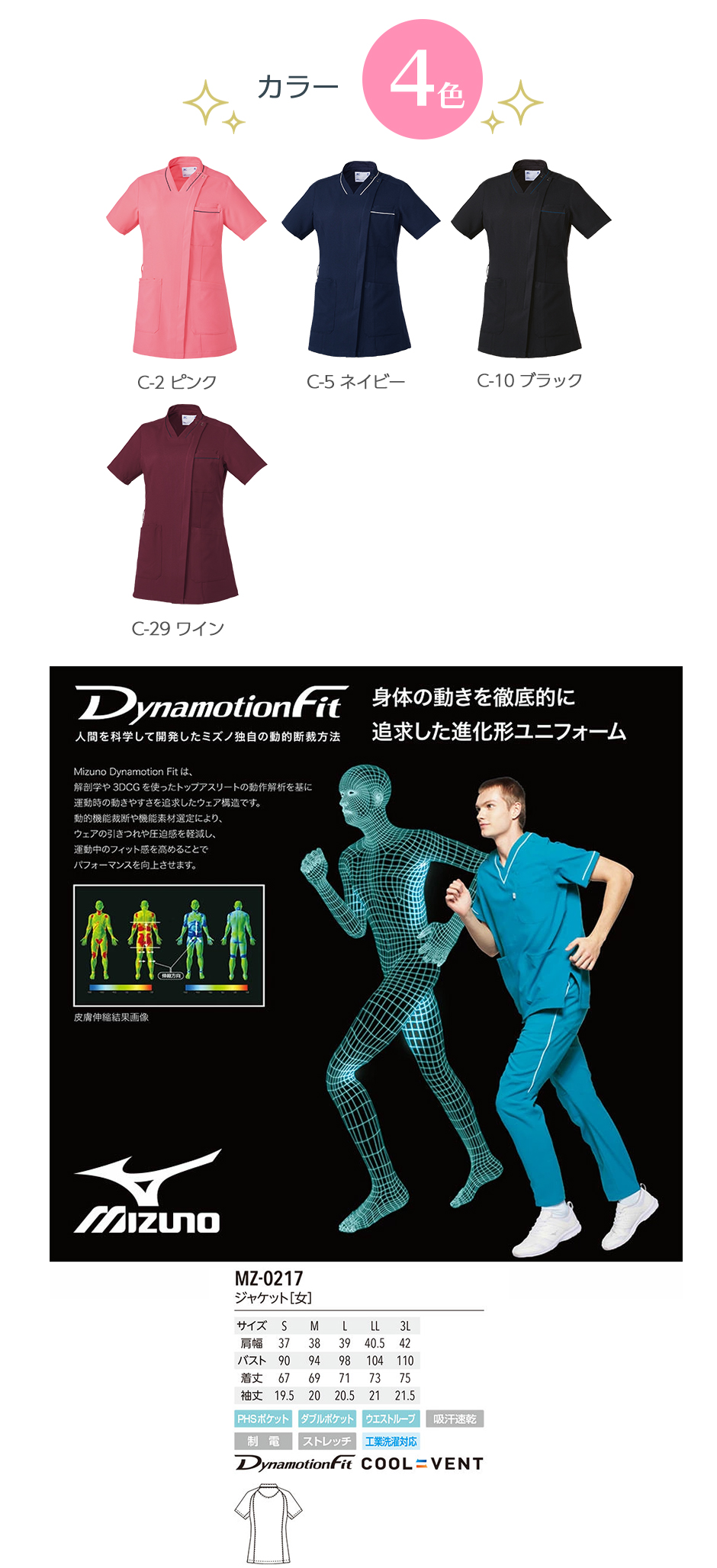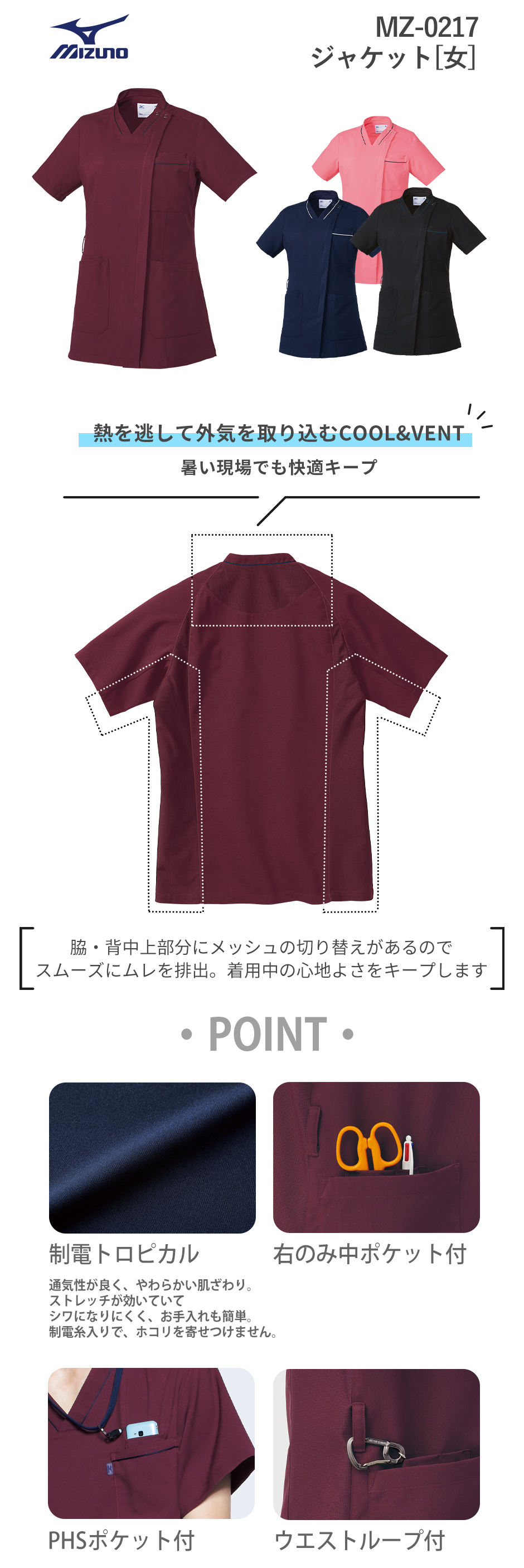 ジャケット 白衣 ケーシー MZ-0217 医療 ミズノ MIZUNO レディース 女性用 半袖 医師 医者 女医 看護師 ナース 医療用 病院 整体 人気 上衣 医務衣 診察衣 制電 ストレッチ 伸縮性 可愛い かわいい おしゃれ おすすめ 通販