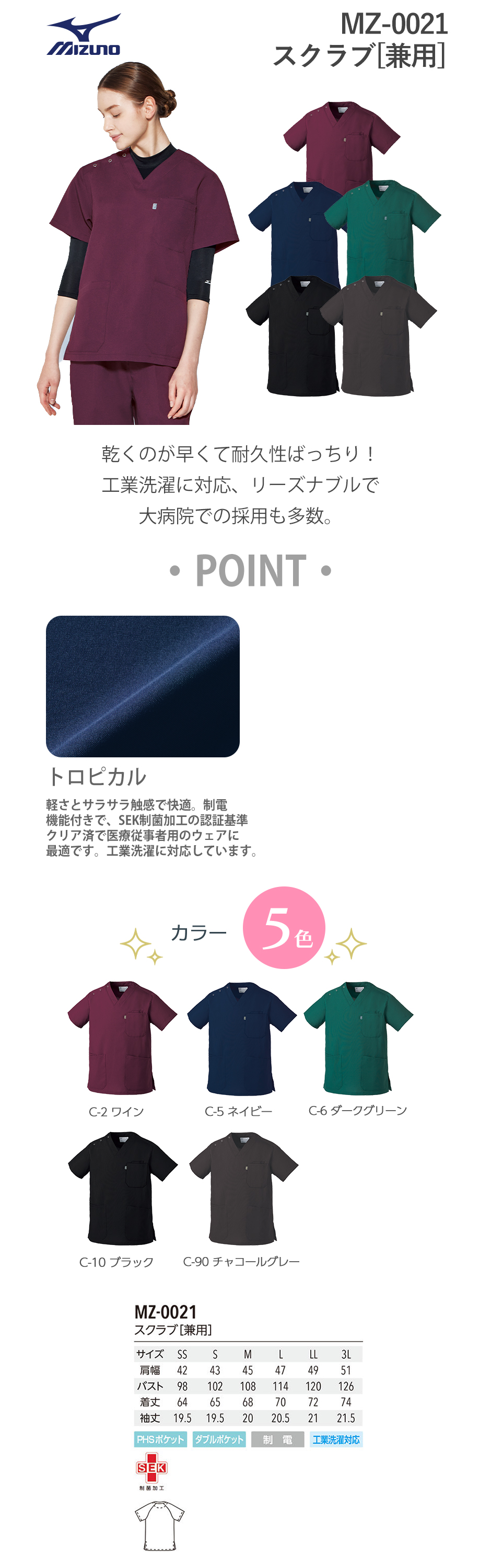 【メール便対応】スクラブ 白衣 医療 ミズノ MIZUNO ユニセックス 男女兼用 半袖 MZ-0021 医師 医者 看護師 ナース 研修医 医療用 人気 手術衣 オペ着 制服 ユニフォーム 抗ウイルス 軽量 制電 病院 クリニック かっこいい 可愛い かわいい おしゃれ 動きやすい