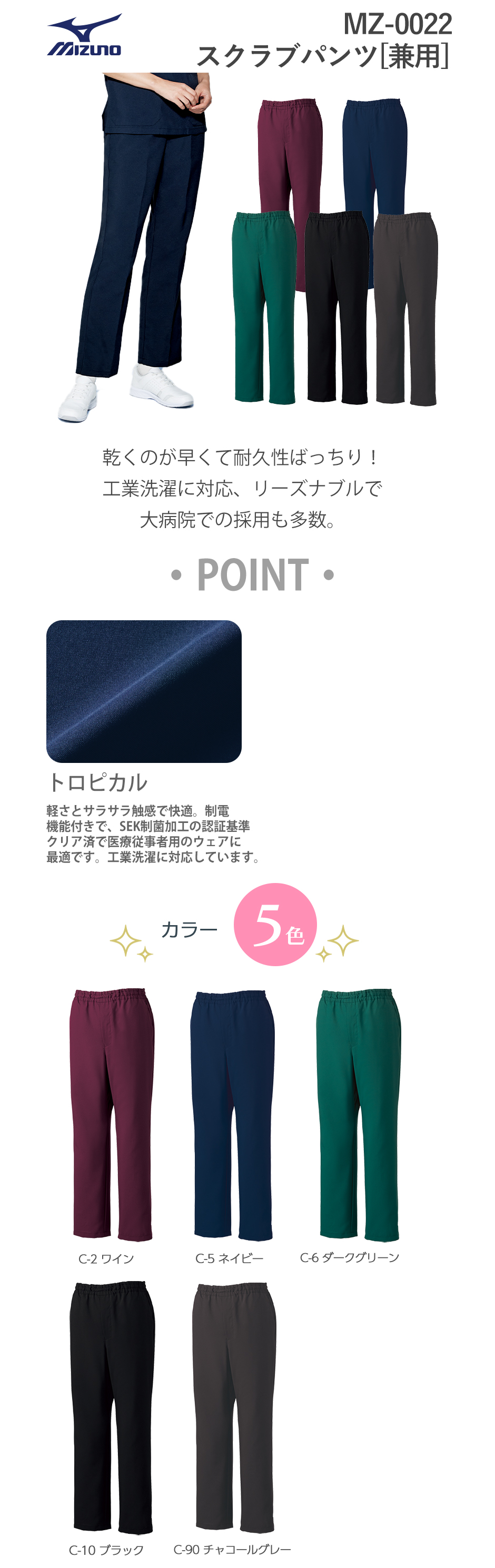 【メール便対応】スクラブ パンツ ミズノ MIZUNO MZ-0022 白衣 ズボン ユニセックス 男女兼用 医療用 人気 制服 ユニフォーム 医師 看護師 ファスナー 病院 おしゃれ かわいい 可愛い かっこいい 動きやすい
