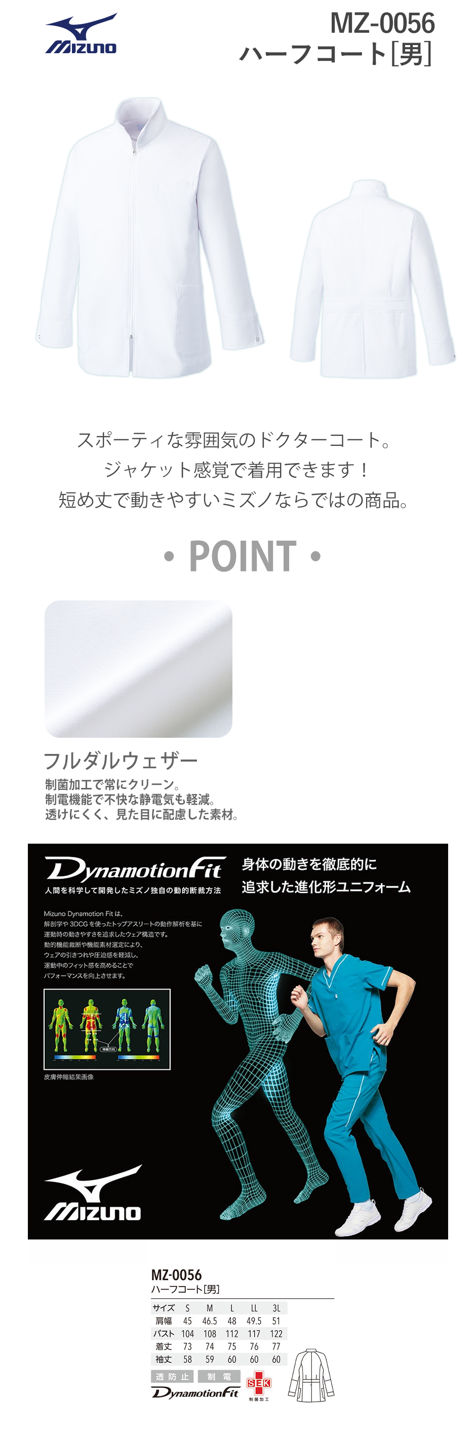 ドクターコート ミズノ MIZUNO MZ-0056 長袖 ハーフコート 白衣 メンズ 男性用 ファスナー 白 ハーフ丈 ショート丈 短め 医者 病院 看護師 ナース 医療用 制服 ユニフォーム おしゃれ かっこいい