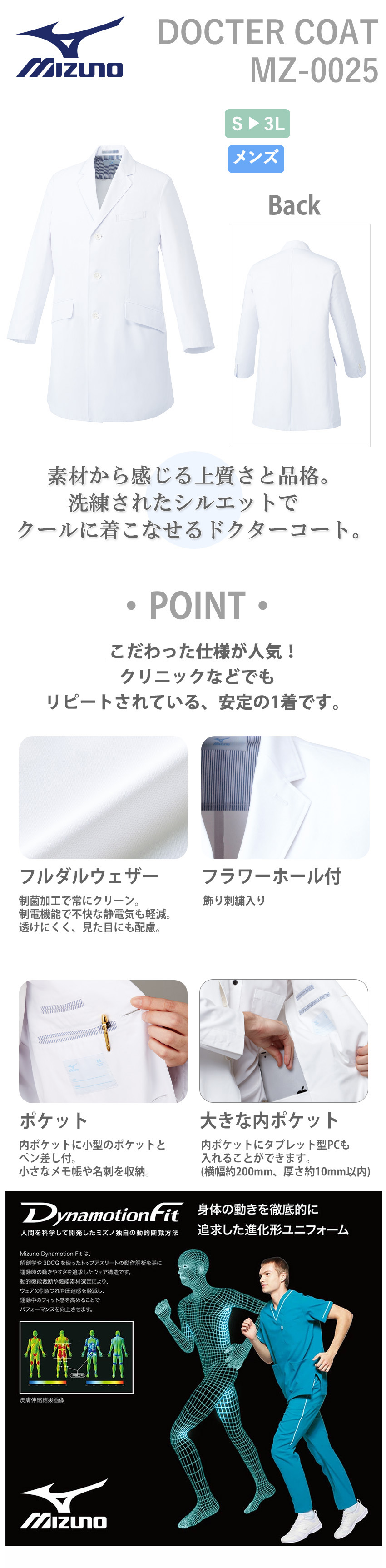 ドクターコート 長袖 MZ-0025 ミズノ MIZUNO 白衣 メンズ 男性用 医者 病院 看護師 ナース 薬剤師 薬局 整骨院 医療用 実験 制服 ユニフォーム ポケット 名入れ おしゃれ かっこいい 動きやすい おすすめ