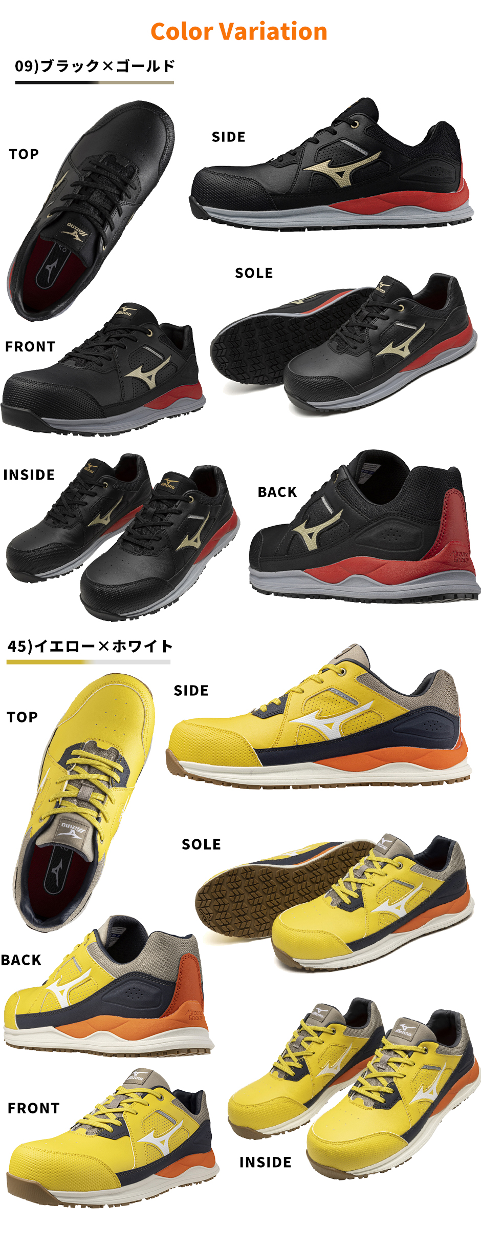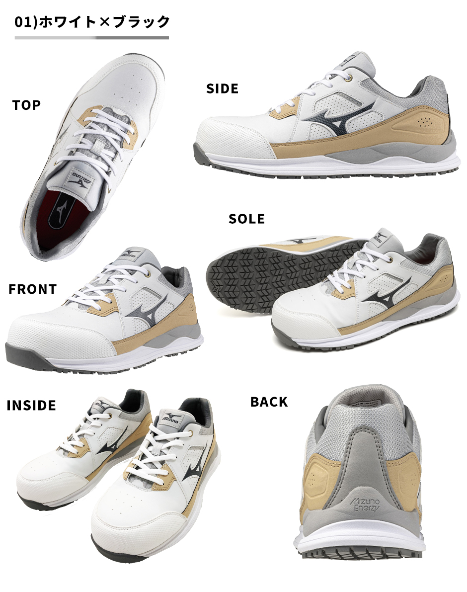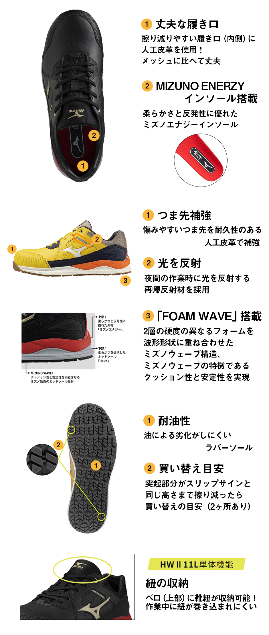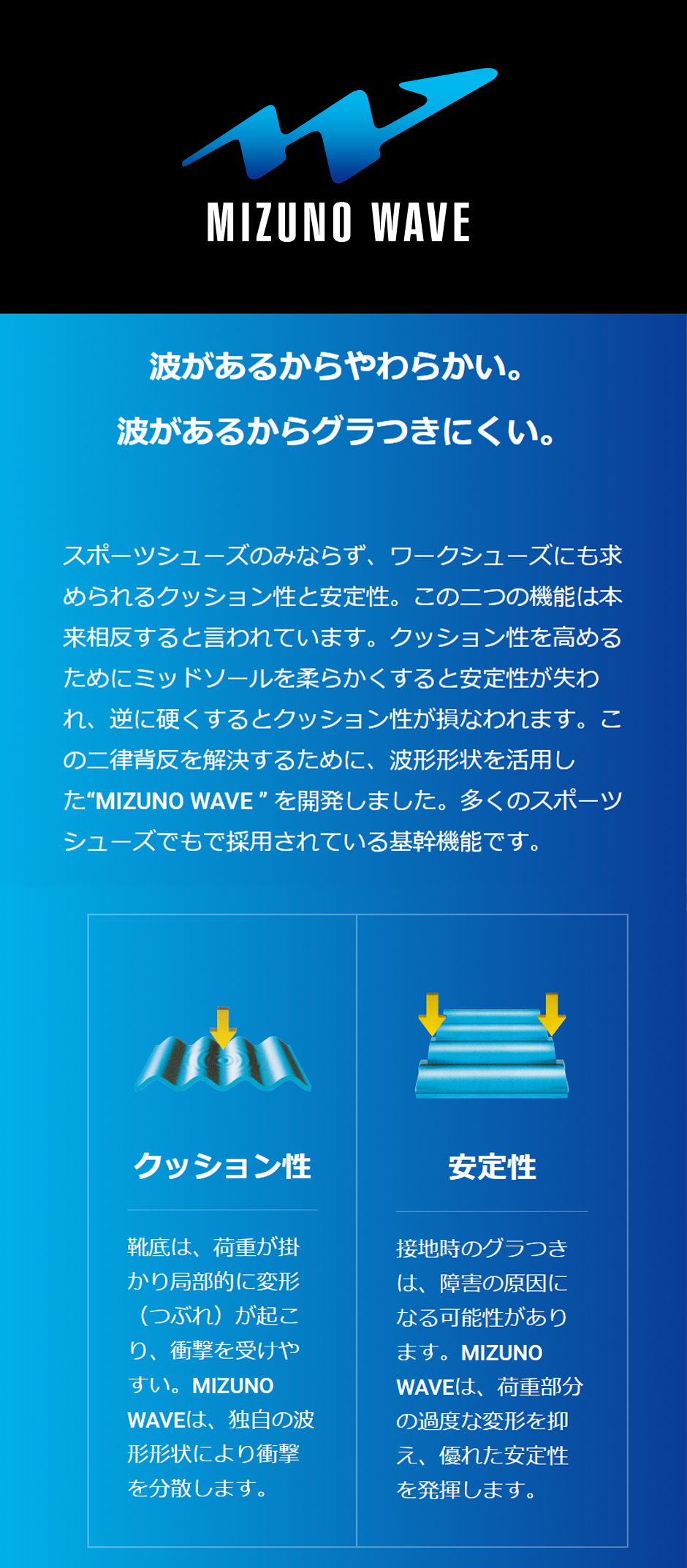 | ミズノのスポーツのテクノロジーをワークシーンへ 多くのアスリートを支えてきた技術を応用。 独自のシューズ設計、機能素材、3次元グラフィックス解析と解剖学を用いた動きやすさの徹底追求など、ミズノならではの開発テクノロジーをいかしてワークシーンも支えています。 スポーツシューズを応用したワークシューズの設計 スポーツで培ってきた技術をワークシューズに反映し、動きをとめずに進み続ける足元をサポート! つま先には、野球シューズに使用されている耐久性に優れた素材を採用! ベロの部分には、テニスシューズなどで使用されている通気性のある構造を採用! しなやかな屈曲性を生み出すために、走りやすさを追求したランニングシューズのアッパーパターンを応用するなど、ミズノの知見と技術を結集させたワークシューズになっています! さまざまな作業環境に対応するミズノの6つの設計。 1.丈夫な履き口 擦り減りやすい履き口の内側に人工皮革を使用し、メッシュに比べて丈夫。 2.先芯 つま先を保護するために硬質樹脂先芯を装着。 3.光を反射 夜間作業時に光を反射する再帰反射材を採用。 4.つま先補強 傷みやすいつま先には、耐久性のある人工皮革で補強。 5.耐油性 油による劣化がしにくいラバーソール。 6.買い替え目安 突起部分がスリップサインと同じ高さまでに擦り減ったら買い替えの目安(6ヶ所あり)。 【商品特徴】 ・丈夫な履き口 ・擦り減りやすい履き口(内側)に人工皮革を使用 ・MIZUNO ENERZY インソール搭載 柔らかさと反発性に優れたミズノエナジーインソール ・つま先補強 傷みやすいつま先を、耐久性のある人工皮革で補強 ・光を反射 夜間の作業時に光を反射する再帰反射材を採用 ・MIZUNO「FOAM WAVE」搭載 2層の硬度の異なるフォームを波形形状に重ね合わせたミズノウェーブ構造、ミズノウェーブの特徴であるクッション性と安定性を実現 ・耐油性油による劣化がしにくいラバーソール ・買い替え目安 突起部分がスリップサインと同じ高さまで擦り減ったら買い替えの目安(2ヶ所あり) ・紐の収納 ベロ(上部)に靴紐が収納でき、ほどけにくく作業中に紐が巻き込まれにくい。 |