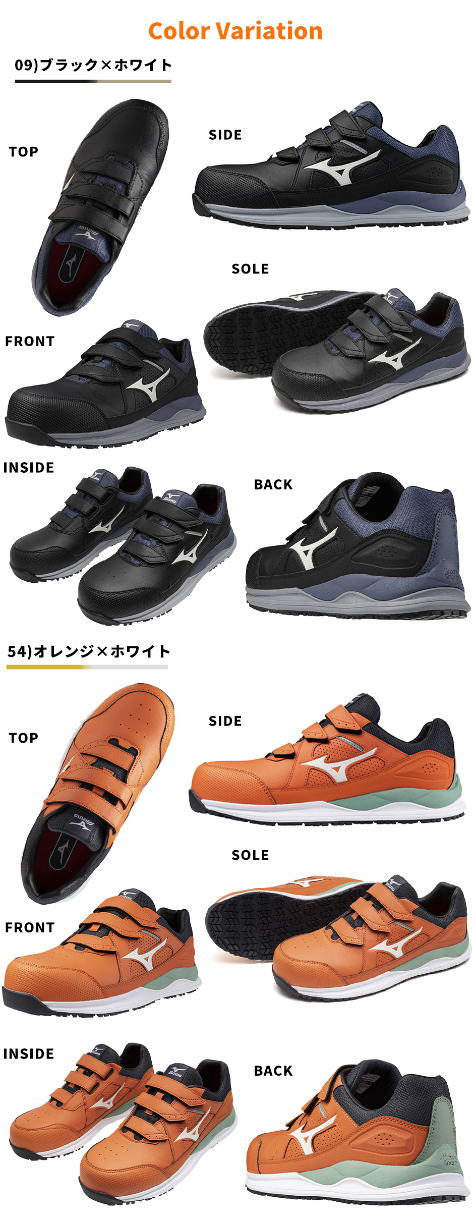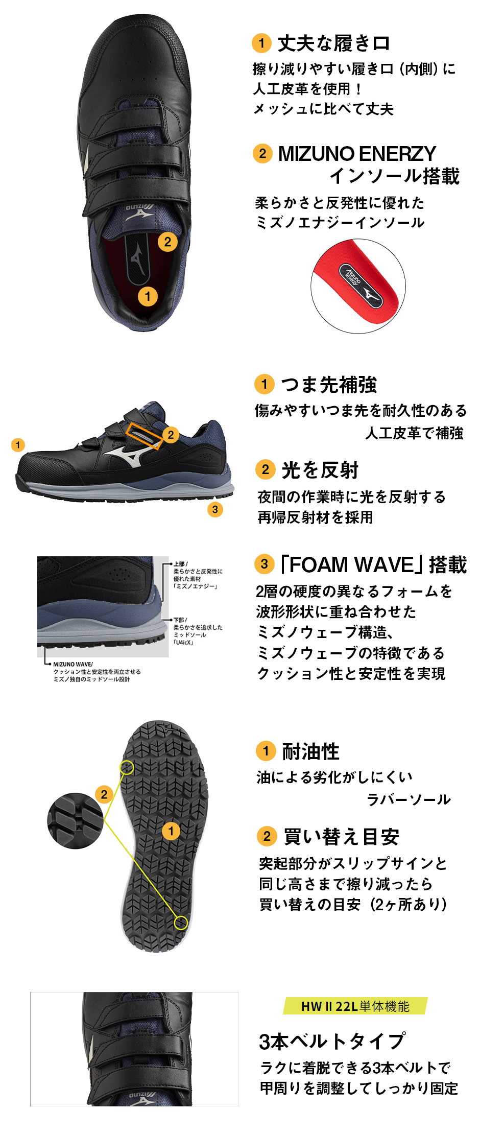 | ミズノのスポーツのテクノロジーをワークシーンへ 多くのアスリートを支えてきた技術を応用。 独自のシューズ設計、機能素材、3次元グラフィックス解析と解剖学を用いた動きやすさの徹底追求など、ミズノならではの開発テクノロジーをいかしてワークシーンも支えています。 スポーツシューズを応用したワークシューズの設計 スポーツで培ってきた技術をワークシューズに反映し、動きをとめずに進み続ける足元をサポート! つま先には、野球シューズに使用されている耐久性に優れた素材を採用! ベロの部分には、テニスシューズなどで使用されている通気性のある構造を採用! しなやかな屈曲性を生み出すために、走りやすさを追求したランニングシューズのアッパーパターンを応用するなど、ミズノの知見と技術を結集させたワークシューズになっています! さまざまな作業環境に対応するミズノの6つの設計。 1.丈夫な履き口 擦り減りやすい履き口の内側に人工皮革を使用し、メッシュに比べて丈夫。 2.先芯 つま先を保護するために硬質樹脂先芯を装着。 3.光を反射 夜間作業時に光を反射する再帰反射材を採用。 4.つま先補強 傷みやすいつま先には、耐久性のある人工皮革で補強。 5.耐油性 油による劣化がしにくいラバーソール。 6.買い替え目安 突起部分がスリップサインと同じ高さまでに擦り減ったら買い替えの目安(6ヶ所あり)。 【商品特徴】 ・丈夫な履き口 ・擦り減りやすい履き口(内側)に人工皮革を使用 ・MIZUNO ENERZY インソール搭載 柔らかさと反発性に優れたミズノエナジーインソール ・つま先補強 傷みやすいつま先を、耐久性のある人工皮革で補強 ・光を反射 夜間の作業時に光を反射する再帰反射材を採用 ・MIZUNO「FOAM WAVE」搭載 2層の硬度の異なるフォームを波形形状に重ね合わせたミズノウェーブ構造、ミズノウェーブの特徴であるクッション性と安定性を実現 ・耐油性油による劣化がしにくいラバーソール ・買い替え目安 突起部分がスリップサインと同じ高さまで擦り減ったら買い替えの目安(2ヶ所あり) ・3本ベルトタイプ ラクに着脱できる3本ベルトで甲周りを調整してしっかり固定 |