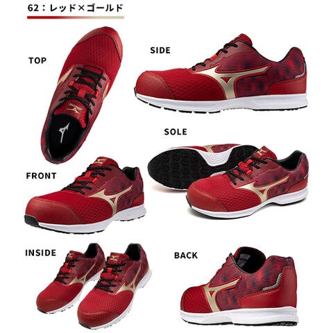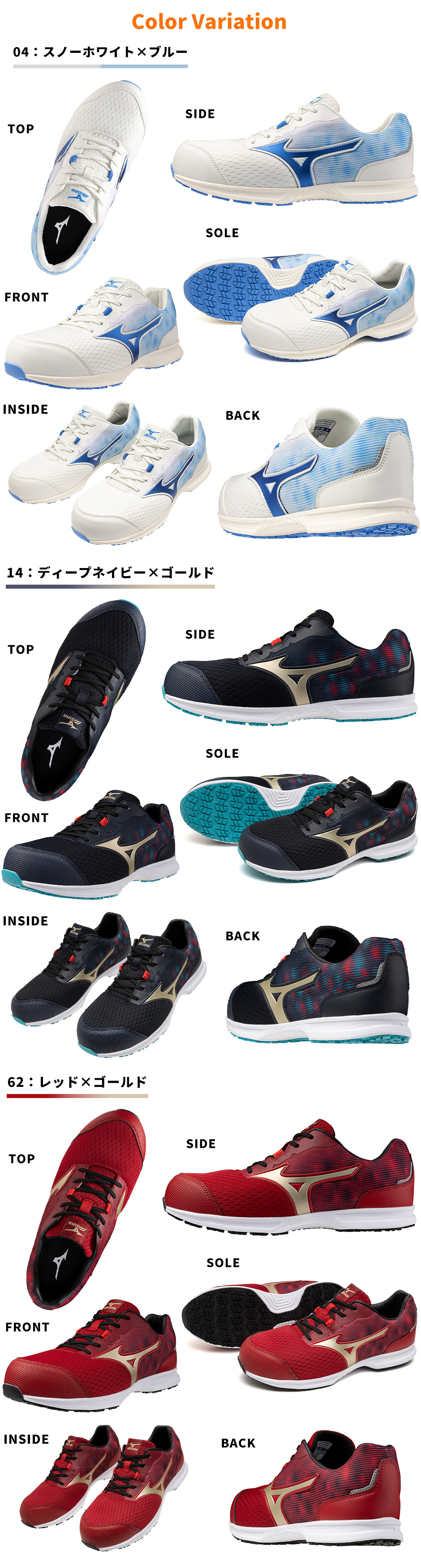 | 多くのアスリートを支えてきた技術を応用。独自のシューズ設計、機能素材、3次元グラフィックス解析と解剖学を用いた動きやすさの徹底追求など、ミズノならではの開発テクノロジーをいかしてワークシーンも支えています。 スポーツシューズを応用したワークシューズの設計 スポーツで培ってきた技術をワークシューズに反映し、動きを止めずに進み続ける足元をサポート! つま先には、野球シューズに使用されている耐久性に優れた素材を採用! ベロの部分には、テニスシューズなどで使用されている通気性のある構造を採用! しなやかな屈曲性を生み出すために、走りやすさを追求したランニングシューズのアッパーパターンを応用するなど、ミズノの知見と技術を結集させたワークシューズになっています! さまざまな作業環境に対応するミズノの6つの設計。 1.丈夫な履き口 擦り減りやすい履き口の内側に人工皮革を使用し、メッシュに比べて丈夫。 2.先芯 つま先を保護するために硬質樹脂先芯を装着。 3.光を反射 夜間作業時に光を反射する再帰反射材を採用。 4.つま先補強 傷みやすいつま先には、耐久性のある人工皮革で補強。 5.耐油性 油による劣化がしにくいラバーソール。 6.買い替え目安 突起部分がスリップサインと同じ高さまでに擦り減ったら買い替えの目安(2ヶ所あり)。 【商品特徴】 |