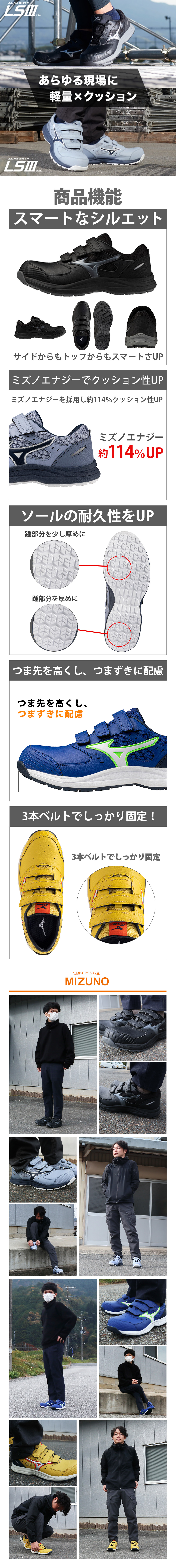 安全靴 ミズノ MIZUNO オールマイティ ALMIGHTY LS3 22L 新作 2026年 新商品 メンズ レディース ベルト マジックテープ JSAA規格 スニーカー 軽量 軽い 耐滑 樹脂先芯 滑りにくい 疲れにくい おしゃれ 人気 建築 建設 倉庫業 運送業 運輸業 22.0~30.0c