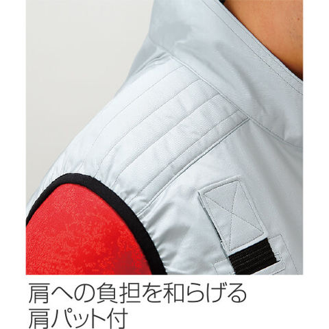 | 草刈り用ベルト取り出し口、背部ランヤード用取り出し口(両開きファスナー付き)、ランヤード用フックハンガー、ファンキャップ留具)、衿裏吸汗メッシュ、立体通風メッシュ、肩パッド、右胸ファスナーポケット |
