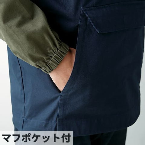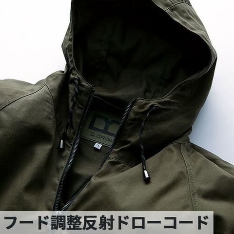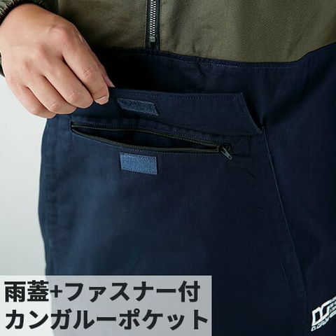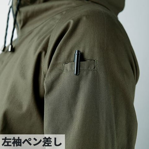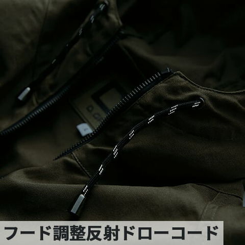 反射フード紐、左袖ペン差し、雨蓋ファスナー付きカンガルーポケット、マフポケット、左右調整ドローコード