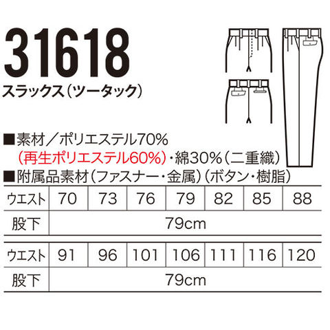 作業服 パンツ スラックス クロダルマ スラックス(ツータック) ウエスト116・120cm 31618 作業着 春夏 リサイクル素材 制電 再生ポリエステル