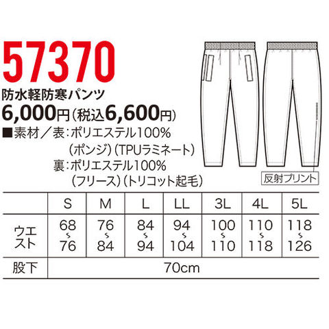 ヤッケ パンツ クロダルマ 防水軽防寒パンツ 57370 小雨 対策 防風 軽量 保温 防水 ストレッチ 反射材