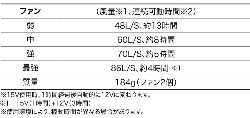 | 重量:184g(ファン2個) 最強(86L/S、4時間)強(70L/S、5時間)中(60L/S、8時間)弱(48L/S、13時間) |