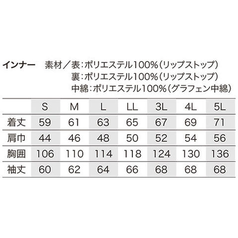 インナー 表:リップストップ(ポリエステル100%)、裏:リップストップ(ポリエステル100%)、中綿:グラフェン再生中綿(ポリエステル100%)