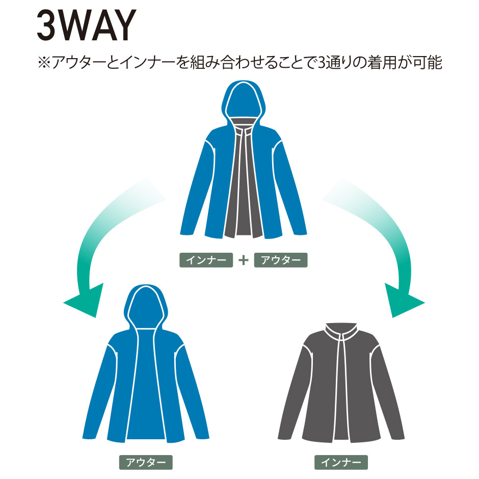 3WAY アウターとインナーを組み合わせることで3通りの着用が可能