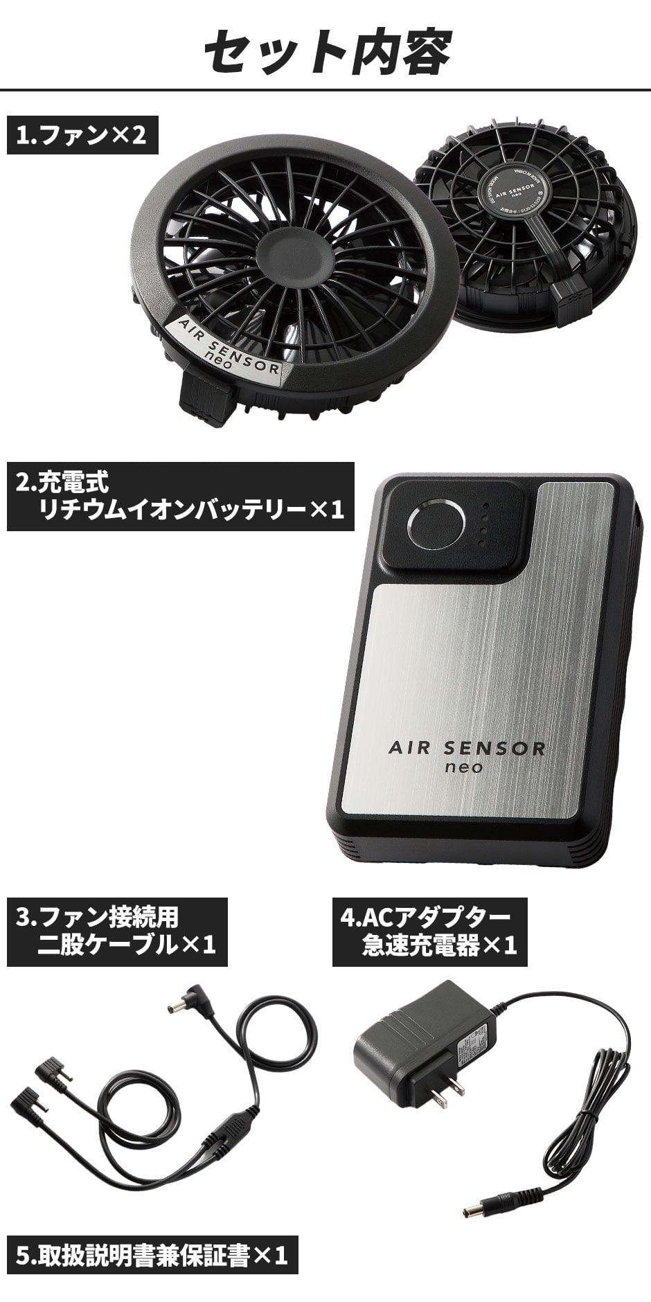 | 内容:ファン2個、ファン接続用二股ケーブル1本、充電式リチウムイオンバッテリー1個、ACアダプター急速充電器1個、取扱説明書兼保証書1冊 |