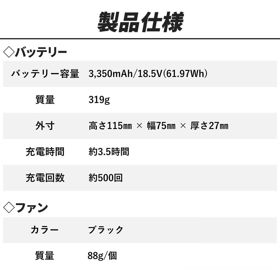| ■ファン(風量、連続稼働時間) 弱:56L/s・約20時間、中:78L/s、約8.5時間、強:95L/s、約5時間、最強:106L/s、約8時間 ファン質量(1個):88g ■バッテリー出力 弱:10V、中:14V、強:17V、最強:20V ■充電式リチウムイオン電池(DC18.5V/3350mAh/61.97Wh) 重量:約319g 外形寸法:W75×D27×H115mm 充電時間:約3.5時間 充電回数:約500回 定格入力:DC21V/1500mA |