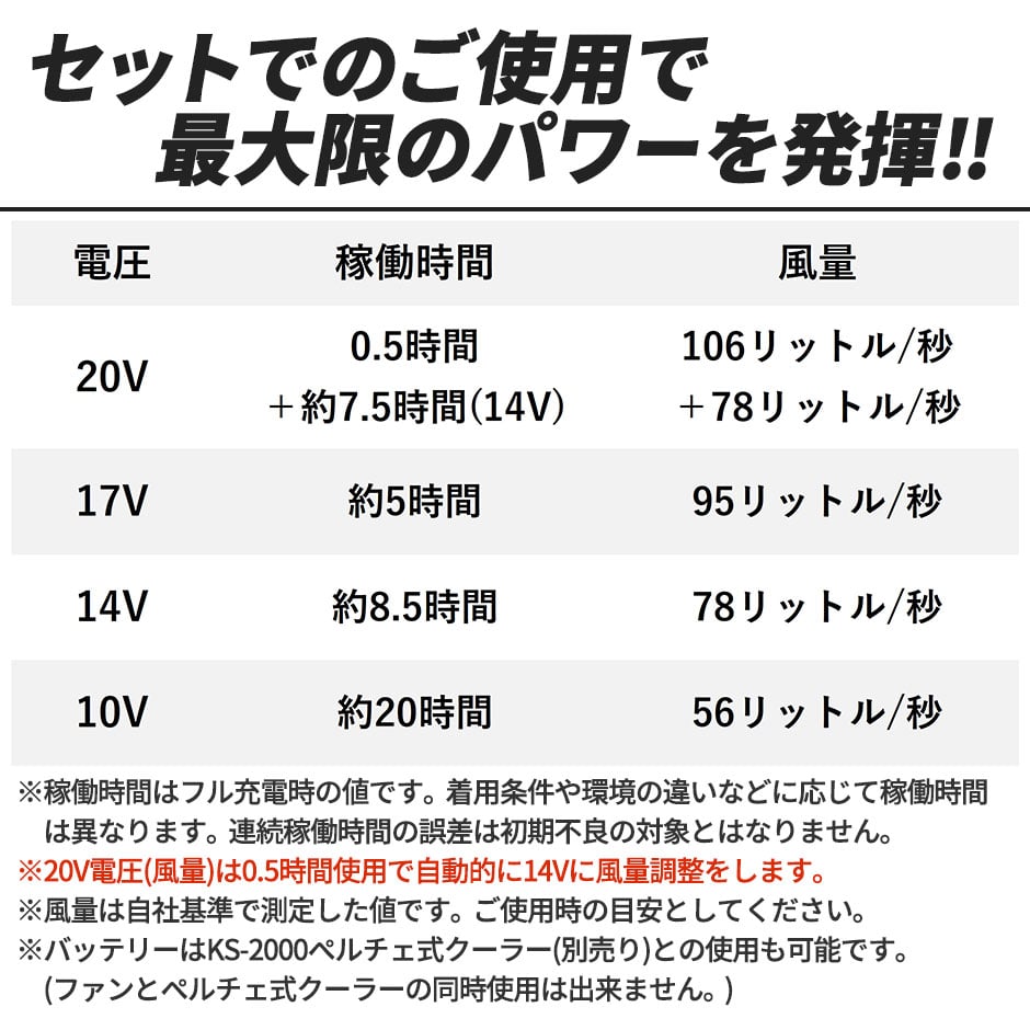 | ■ファンセット:KS-203 ■リチウムイオンバッテリー:KS-204 ■ファン接続用二股ケーブル:KS-205 ■AC充電用アダプター:KS-206 |