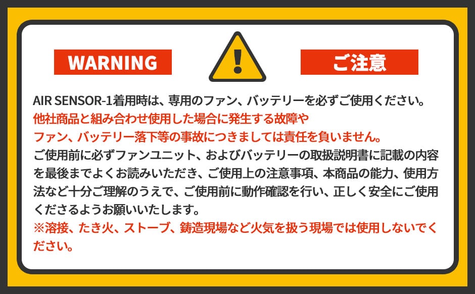| デバイスとウェアは必ずクロダルマのAIR SENSOR-1製品同士での組み合わせでご使用ください。他社メーカー製品との組み合わせでご使用になられた際のトラブルには一切対応を致しかねます。 |