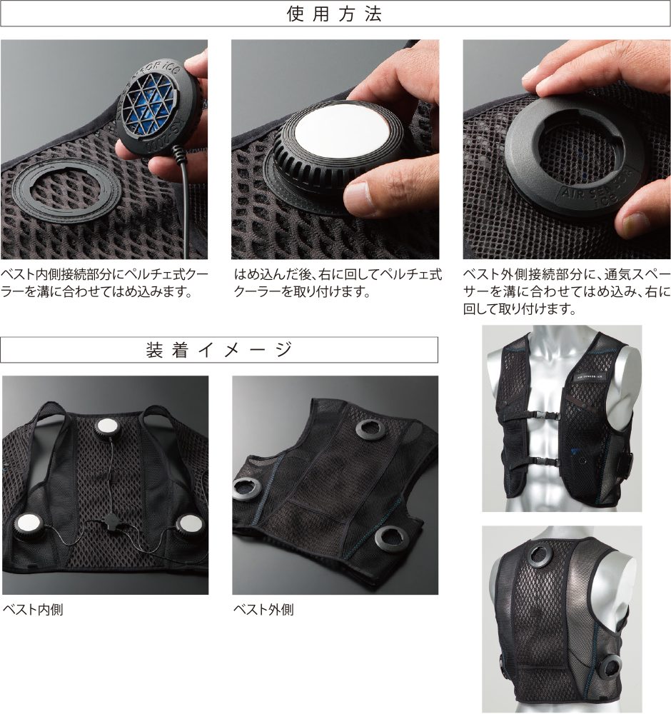 | 内容:ペルチェ式クーラー専用ベスト(品番:26873)、ペルチェ式クーラー3個+通気スペーサー3個(品番KS-2003 ×3)、ミニバッテリー(品番KS-110)、三股ハブケーブル(品番KS-2005)、ACアダプター充電器(品番KS-106)、本説明書兼保証書 装着方法 1.ベスト内側接続部分にペルチェ式クーラーを溝に合わせてはめ込みます。 2.はめ込んだ後、右に回してペルチェ式クーラーを取り付けます。 3.ベスト外側接続部分に通気スペーサーを溝に合わせてはめ込み右に回して取り付けます。 |