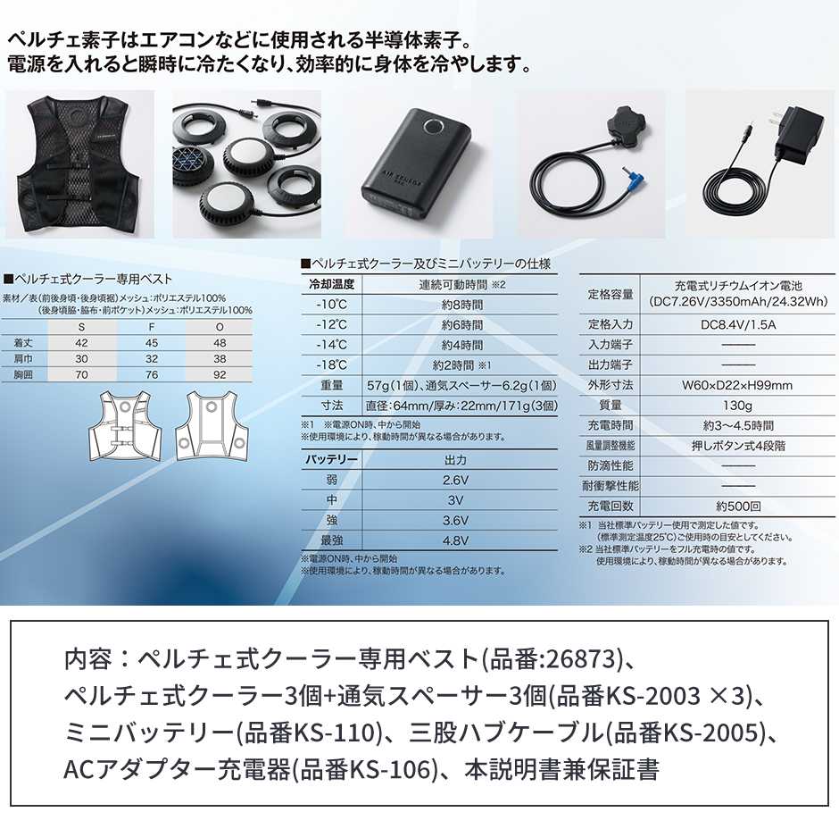 | ■ペルチェ素子KS-2003 ペルチェ式クーラー+通気スペーサー ■バッテリー KS-2204 リチウムイオンミニバッテリー KS-110 リチウムイオンミニバッテリー KS-254 リチウムイオンバッテリー KS-204 リチウムイオンバッテリー ■ケーブル類 KS-2005 三股ハブケーブル KS-106 ACアダプター充電器 ■ペルチェデバイスフルセット KS-2200 ペルチェデバイスフルセット (KS-2003 ペルチェ式クーラー+通気スペーサー×3組/KS-2204 リチウムイオンミニバッテリー1個/KS-2005 三股ハブケーブル1本/KS-106 ACアダプター充電器1個) KS-2000 ペルチェデバイスフルセット (KS-2003 ペルチェ式クーラー+通気スペーサー×3組/KS-110 リチウムイオンミニバッテリー1個/KS-2005 三股ハブケーブル1本/KS-106 ACアダプター充電器1個) ■ベスト+ペルチェデバイスフルセット KS-2300 ベスト+ペルチェデバイスフルセット (26890 ペルチェ用ベスト/KS-2003 ペルチェ式クーラー+通気スペーサー×3組/KS-2204 リチウムイオンミニバッテリー1個/KS-2005 三股ハブケーブル1本/KS-106 ACアダプター充電器1個) KS-2100 ベスト+ペルチェデバイスフルセット (26873 ペルチェ用ベスト/KS-2003 ペルチェ式クーラー+通気スペーサー×3組/KS-110 リチウムイオンミニバッテリー1個/KS-2005 三股ハブケーブル1本/KS-106 ACアダプター充電器1個) ※互換性があるため、合わせてご使用いただけます。 |