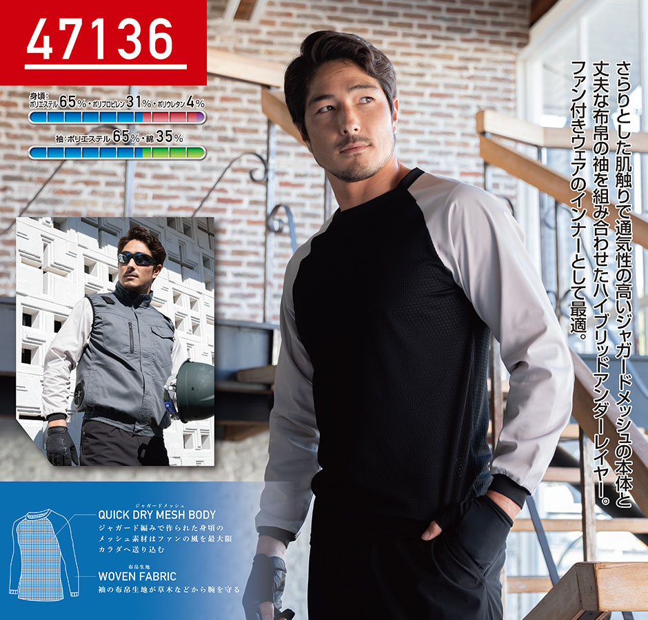インナー 長袖 クロダルマ ハイブリッド長袖アンダーレイヤー 47136 夏用 涼しい クール ストレッチ 通気 ラグランスリーブ 本体メッシュ 袖が帛生地 ファン付きベストのインナーに最適