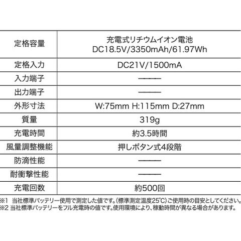 | ■充電式リチウムイオン電池(DC18.5V/3350mAh/61.97Wh) 重量:約319g 外形寸法:W75×D27×H115mm 充電時間:約3.5時間 充電回数:約500回 定格入力:DC21V/1500mA |