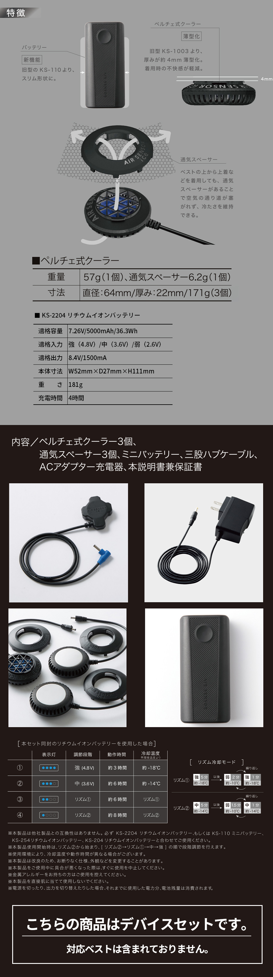 | 特徴:バッテリー 旧型のKS-110よりスリム形状に! 品番:KS-2204 ( 適格容量:7.26V/5000mAh/36.3Wh) 適格入力:8.4V/1500mA 適格出力:強(4.8V)/中(3.6V)/弱(2.6V) 充電時間:4時間 ・サイズ:W52mm×D27mm×H111mm ・重さ:181g ペルチェ式クーラー 旧型KS-1003より、厚みが約4mm薄型化。着用時の負担が軽減 通気スペーサー ベストの上から上着などを着用しても、通気スペーサーがあることで空気の通り道が塞がれず、冷たさキープ! 内容:ペルチェ式クーラー3個、通気スペーサー3個、ミニバッテリー、三股ハブケーブル、ACアダプター充電器、本説明書兼保証書 装着方法 1.ベスト内側接続部分にペルチェ式クーラーを溝に合わせてはめ込みます。 2.はめ込んだ後、右に回してペルチェ式クーラーを取り付けます。 3.ベスト外側接続部分に通気スペーサーを溝に合わせてはめ込み右に回して取り付けます。 |