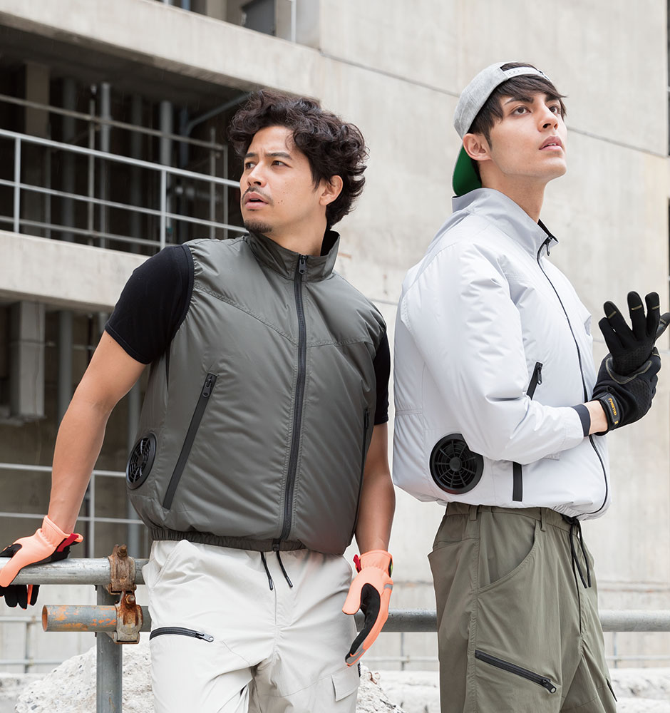 | 左袖ペン差し、風が漏れにくい裾ゴム仕様、脇ポケットバッテリーコードホール、ファスナー付左右脇ポケット |